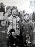 А это я с сестрой Леной "Волк и заяц". Я даже помню, это возле садика на забор повесили покрывало с пейзажем и поставили фигурки волка и зайца.